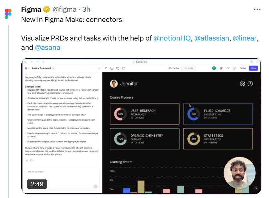 The initial set of connectors includes Notion, Atlassian, Linear, and Asana. Teams can link planning artifacts and task lists to their work in Figma Make, giving designers and product managers a shared view of what needs to ship and why. The post did not specify whether the integrations support actions like editing or two-way sync.